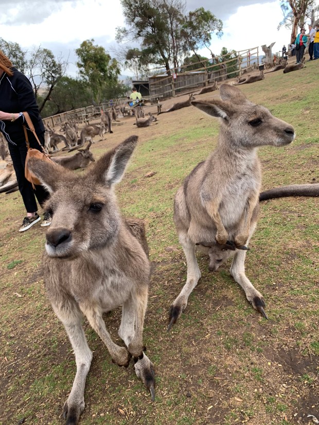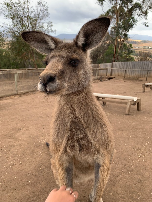 Bonorong Wildlife Sanctuary- this was about half an hour drive from Hobart and marked our first up close interaction with kangaroos. We absolutely loved it. It’s not huge, but definitely a must see. The rangers look after injured, orphaned and endangered animals and you could see how much they truly cared for them. There were huge boxes full of kangaroo food all over the sanctuary which were free to take from ( I literally emptied my handbag and filled it with food) and then you could just slowly walk over to a kangaroo, crouch down and let it feed right out of your hand. Sam virtually had to drag me out after, I just wanted to keep doing it! The babies were absolutely gorgeous, climbing in and out of their mum’s pouches, with such fluffy fur and fluttery eyelashes. We also saw a male kangaroo standing like a bouncer here which gave us a laugh (see below)